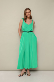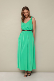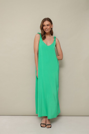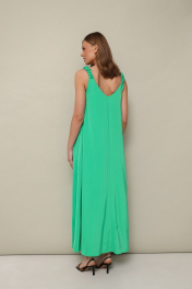 Лаконичное платье А-образного силуэта, выполнено из струящейся ткани с благородным матовым блеском. V-образный вырез горловины переда и спинки. Стильным акцентом служат переплетенные бретели из основной ткани. В боковых швах обработаны карманы. Спинка со средним швом. Изделие без подкладки.