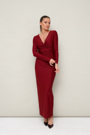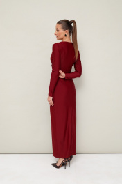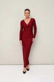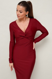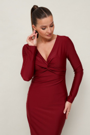 Платье прилегающего силуэта в длине миди. Горловина округлой формы с вырезом «капля». На лифе обработан декоративный узел с подрезом под линией груди. Рукава длинные втачные.