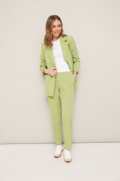 Комплект 2-предметный, состоящий из жакета и брюк, выполненный из костюмной ткани. Жакет прямого силуэта, с центральной застежкой на петлю и пуговицу. Воротник пиджачного типа с отложными лацканами. Спереди обработаны накладные карманы. Рукава втачные, двухшовные. Жакет на подкладке. Брюки прямого силуэта слегка зауженные к низу, с заутюженными стрелками и с боковыми наклонными карманами. Застежка на пуговицу и тесьму-молнию. Пояс притачной на резинке для регуляции размера. На задних половинках брюк обработаны карманы с листочками.