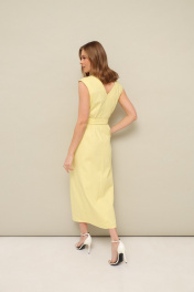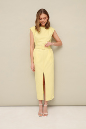 Стильное платье в длине миди, отрезное по линии талии, выполнено из джинсовой ткани. Вырез горловины - лодочка. По плечевым швам лифа и по талии обработаны защипы. Юбка со средним швом, переходящим в разрез. Спинка в V-образным вырезом. В среднем шве застёжка на потайную тесьму молнию. В комплекте прилагается пояс из основной ткани с обтяжной пряжкой.