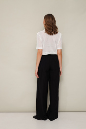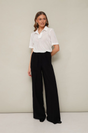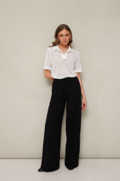 Стильный 2-х предметный комплект, состоящий из поло и брюк. Поло с отложным воротником с цельнокроеной стойкой, V-образный вырез горловины обработан притачными планками. Короткие втачные рукава. Брюки прямого силуэта с боковыми наклонными карманами, спереди обработана имитация гульфика. Пояс притачной на резинке, для регуляции размера.