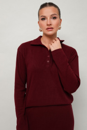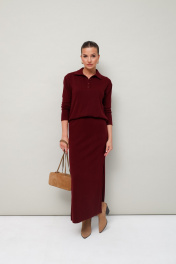 Комфортный трикотажный комплект, состоящий из поло и юбки. Поло с отложным воротником с цельнокроеной стойкой. Вырез горловины обработан притачными планками с застежкой на петли и пуговицы. Спущенная линия втачивания рукава. Юбка прямого кроя, пояс на резинке, в боковых швах обработаны высокие разрезы.