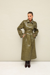 Плащ актуального прямого силуэта, выполнен из плотной экокожи с тиснением. Воротник пиджачного типа с отложными лацканами. Двубортная застёжка на петли и пуговицы. По плечевому шву обработаны погоны. Спереди отлетная кокетка и наклонные карманы с листочкой. Рукава кроя реглан, с патами по низу, с фиксацией на пуговицы. Спинка со средним швом. Для удобства движения сзади обработана шлица. Тренч на подкладке. В комплекте пояс из основной ткани с пряжкой.