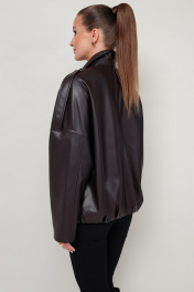 Женская куртка свободного силуэта, выполнена из экокожи высокого качества. Горловина с рубашечным воротником. Плечевые швы с патами на потайных кнопках. Центральная застёжка на металлическую молнию с защитной планкой на потайных кнопках. Спереди обработаны функциональное прорезные карманы с листочками. Двухшовные рукава со спущенной линией втачивания плеча. Спинка со средним швом. Низ собран на резинку для комфорта и регуляции размера. Куртка на подкладке.