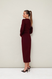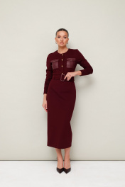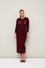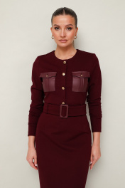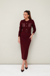 "Платье прилегающего силуэта, отрезное по линии талии, выполнено из эластичного трикотажного полотна. Горловина округлой формы. По лифу обработана планка с пуговицами и нагрудные накладные карманы с клапанами. Длинные втачные рукава. Спинка с застежкой на потайную молнию в среднем шве. Для удобства движения сзади обработан разрез. По поясу предусмотрены шлевки. В комплекте прилагается пояс из основной ткани с пряжкой."