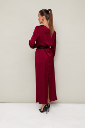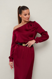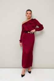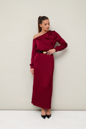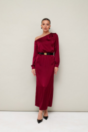 Вечернее платье полуприлегающего силуэта, выполнено из струящейся ткани с благородным матовым блеском. Ассиметричный вырез горловины с открытым плечом. Правый плечевой шов декорирован складками. Платье отрезное по линии талии на резинке. Рукава длиннные с манжетами с застежкой на петли и пуговицы. По спинке в среднем шве юбки обработан разрез. В комплекте прилагается ремень с акцентной пряжкой
