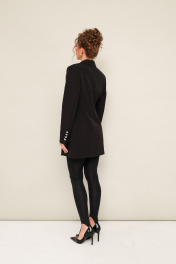 Стильный жакет полуприлегающего силуэта, выполнен из костюмной ткани. Смещенная застежка на петлю и пуговицу. Воротник пиджачного типа с отложными лацканами, край борта скругленный по низу жакета. Спереди обработаны прорезные карманы в рамку с клапанами. Рукава втачные, двухшовные со шлицами с застежкой на петли и пуговицы. Спинка с рельефами и средним швом. Жакет на подкладке.В комплекте прилагаются леггинсы со штрипками.