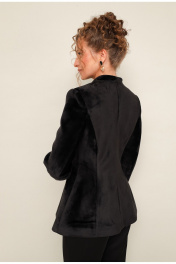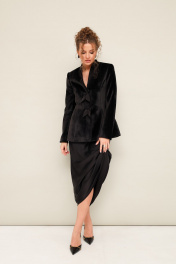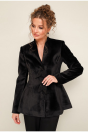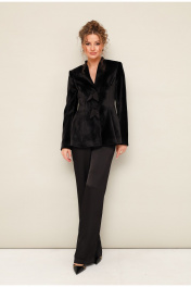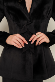 Вечерний жакет полуприлегающего силуэта, слегка расширенный к низу, выполнен из плотного бархата. Горловина с цельнокроеной стойкой и V-образным вырезом. Центральная застёжка на потайные пришивные кнопки. Перед с рельефами и декоративными бантами. Рукава втачные, двухшовные. Спинка с рельефами и средним швом. Жакет обработан подкладкой.