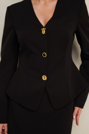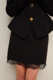 Комплект, состоящий из жакета, юбки и шарфа, выполнен из костюмной ткани. Силуэтный жакет актуального кроя с V-образным вырезом горловины. Центральная застёжка на петли и пуговицы. Рукава втачные, двухшовные. Юбка в длине мини, на обтачке по поясу, с застежкой на потайную молнию в среднем шве спинки. Низ юбки декорирован французским кружевом. Жакет и юбка обработаны подкладкой.