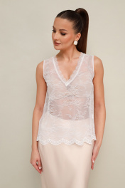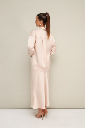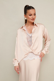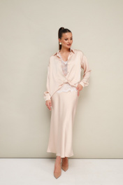 Комплект тройка, состоящий из блузки, топа и юбки. Элегантная блузка прямого кроя, выполнена из струящейся ткани с благородным матовым блеском. Горловина с рубашечным воротником на отрезной стойке, центральная застежка на петли и пуговицы. Перед блузки выполнен с декоративным перекрутом в низжней части застежки. Рукава со спущенной линией втачивания плеча, манжеты с застежкой на петли и пуговицы. Спинка с отрезной кокеткой и бантовой складкой. Топ прямого силуэта, выполнен из изысканного французского кружева. V-образный вырез горловины обработан кружевной отделкой. Юбка с кроем «по косой» в длине миди, пояс на обтачке, застежка в боковом шве на потайную тесьму молнию.