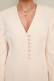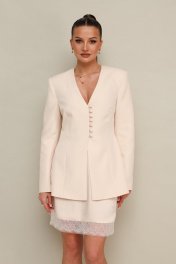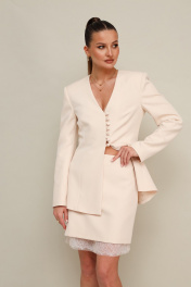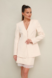 2-х предметный жакет, состоящий из жакета и юбки, выполненный из костюмной ткани. Жакет полуприлегающего силуэта с V-образным вырезом горловины. Центральная застёжка на навесные петли и обтяжные пуговицы. Рукава втачные, двухшовные. Жакет обработан подкладкой. Юбка прямого силуэта в длине мини. Верхняя юбка выполнена из костюмно-плательной ткани, пояс на обтачке, застёжка на потайную молнию в среднем шве по спинке. Нижняя юбка на резинке по поясу, низ обработан кружевной отделкой с сеткой.