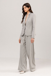 Костюм: жакет+брюки. Жакет приталенного силуэта, на подкладке: •накладные карманы •втачной рукав •застежка на пуговицу Брюки палаццо: • застежка на гульфик и молнию •по спинке на резинке, по талии дополнительно регулируются шнуром •в боковых швах карманы