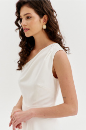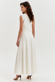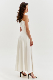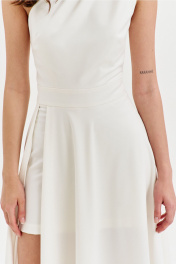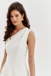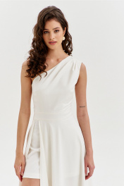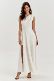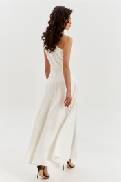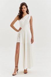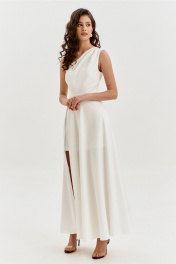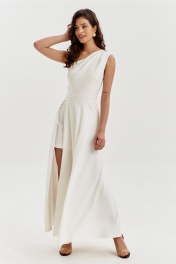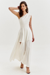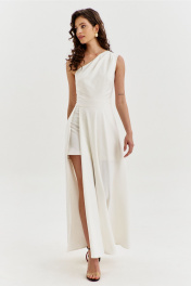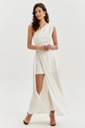 Платье полуприлегающего силуэта, длиной макси. Платье отрезное по лини талии с притачным поясом. Лиф выполнен на одно плечо, по спинке с талиевыми вытачками, по переду с нагрудными вытачками и односторонними складками от плеча. Юбка платья силуэта полусолнце. По спинке со средним швом, по переду с высоким разрезом. Платье дополнено шортами, притачанными к поясу. Шорты длиной выше середины бедра. В правом боковом шве обработана застежка на потайную тесьму-«молнию».