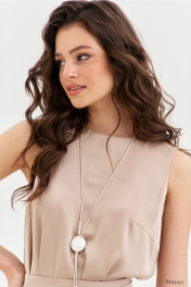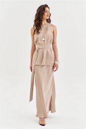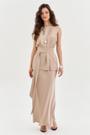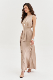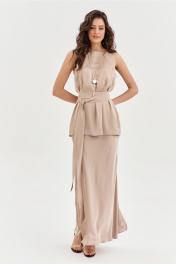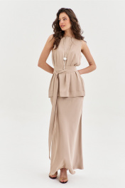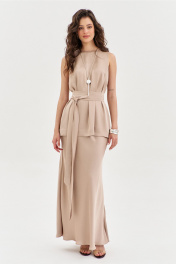 Комплект женский, состоящий из блузки и юбки. Блузка свободного кроя, длиной ниже линии бедер. Спинка со средним швом, в котором по горловине обработана застежка на навесную петлю и пуговицу. По переду нагрудные вытачки. Блузка без рукавов. Горловина округлой формы. блузку дополняет съемный пояс. Юбка А-образного силуэта, длиной чуть ниже щиколотки. Верхний срез юбки обработан резинкой.