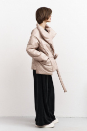 Куртка свободного кроя: -асимметричный низ -сбоку притачной несъёмный пояс - накладные карманы по бокам -отложной воротник-стойка .