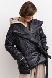 Куртка свободного кроя: -асимметричный низ -сбоку притачной несъёмный пояс - накладные карманы по бокам -отложной воротник-стойка .