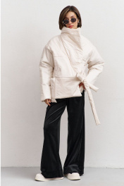 Куртка свободного кроя: -асимметричный низ -сбоку притачной несъёмный пояс - накладные карманы по бокам -отложной воротник-стойка .