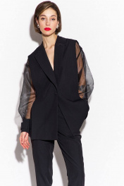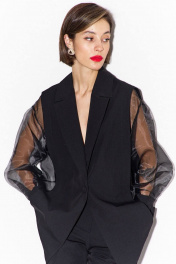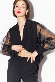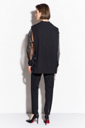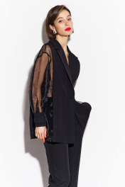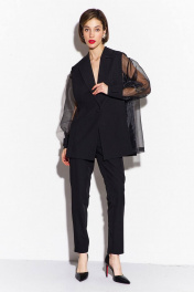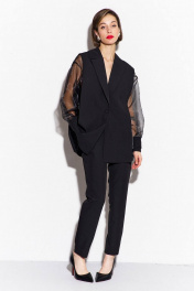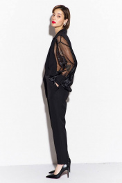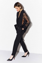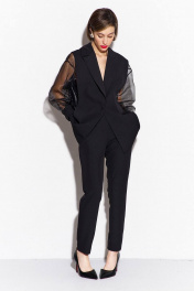 Костюм женский (жакет и брюки): -жакет прямого силуэта, длиной ниже бедер -линия плеча спущена, рукава одношовные, втачные, длинные -воротник пиджачного типа -жакет на подкладке -брюки полуприлегающего силуэта, длиной до щиколотки, на резинке сзади в талии -по переду выполнена застежка на тесьму-«молнию».