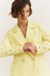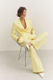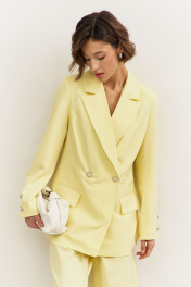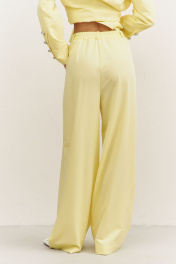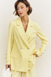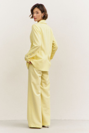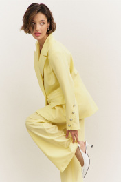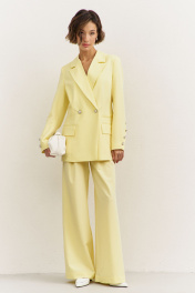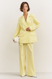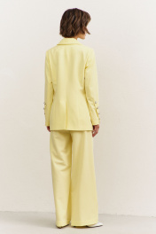 Костюм женский ( жакет и брюки) : -жакет полуприлегающего силуэта -рукава длинные, двушовные, втачные -локтевой шов с фигурной шлицей и декоративными пуговицами -воротник пиджачного типа -жакет на подкладке с плечевыми накладками -брюки длинные, широкие -застежка на пуговицу.