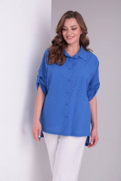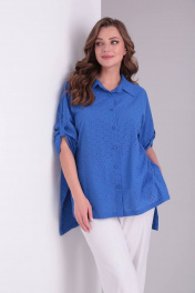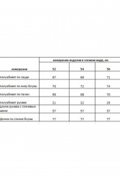 Блузка свободного кроя с центральной застежкой на петли-пуговицы. Воротник на стойке. В рукавах паты. В боковых швах разрез-шлица с декоративными пуговицами. Спинка прямая,удлиненная. Длина рукава с плечевым швом 57 см. Длина по спинке блузы 77 см.