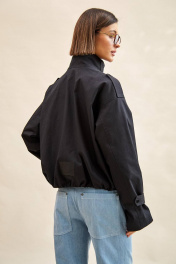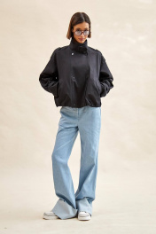 Куртка из джинса: - прямой силуэт; - спущенная линия плеча; - на подкладке; - спереди прямые рельефы; - застежка спереди на два ряда кнопок; - на плечевых швах погоны; - спереди карманы с листочкой; - воротник-стойка с патами, застегивающимися на прямоугольную пряжку; - рукава прямые двухшовные с патами по низу; - низ по спинке и по бокам оформлен сборкой; - на спинке аппликация с логотипом.