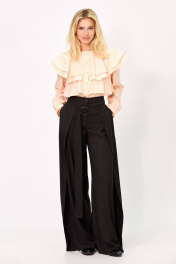 Блуза: - полуприталенный силуэт - воротник стойка - застежка: планка на пуговицах - рукав свободный с прямой манжетой - широкие декоративные воланы от горловины по переду и спинке