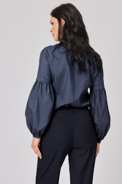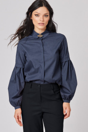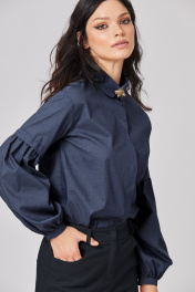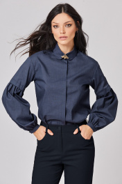 Блуза: - прямой силуэт - потайная застёжка на пуговицы - воротник рубашечный со скругленным уголком - съемная брошь в комплекте - рукав втачной, состоящий из двух частей: узкой и расширенной со сборкой - по низу рукава тонкая манжета с застёжкой на пуговицу.