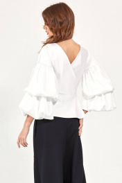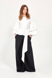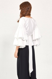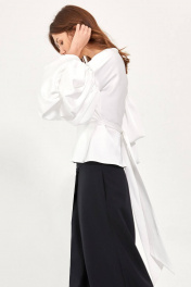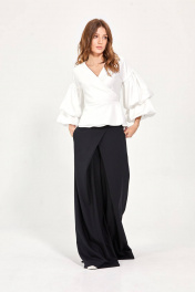 Блуза: Основной вариант: - приталенный силуэт - возможно надеть задом наперёд - V-образный вырез горловины - спереди запах с завязкой на пояс - спущенная линия плеча - двухъярусные рукава - юбка «полусолнце» Можно носить и задом наперёд: - круглый вырез горловины - запах с завязкой на пояс оказывается сзади