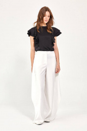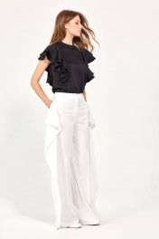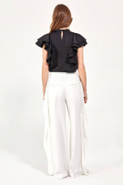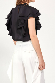Блуза: - прямой силуэт - спереди и на спине прямые рельефы, в которые вставлены двухслойные воланы -спинка со средним швом, сверху которого разрез и застёжка на пуговицу и навесную петлю -воротник стойка - проймы обработаны бейкой