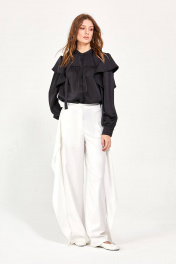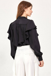 Блуза: - расширенный силуэт - рукава втачные на манжете - воланы в проймах - кокетки спереди с сзади с небольшой сборкой - застёжка на пуговицы по планке