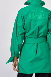 Блуза: - полуприлегающий силуэт - спущенная линия плеча - спереди фигурные карманы с фигурными клапанами - на спинке переходящая на перед кокетка с вышивкой; от кокетки вниз — бантовая складка - застёжка: потайная планка с пуговицами - рукава с манжетами и тремя складками по низу - воротник: рубашечный - разрезы в боковых швах - в комплекте пояс из основной ткани