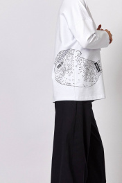 Лонгслив: - ткань: футер двухнитка - силуэт прямой - спущенная линия плеча - по горловине планка из основного материала, швы закрыты киперной лентой - спереди и на спинке печать