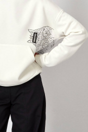 Худи с начесом и печатью: - силуэт прямой - линия плеча спущена - сверху двухслойный капюшон с небольшим запахом - спереди карман-кенгуру - по низу изделия и рукавов манжеты из основного материала - спереди и на спинке печать