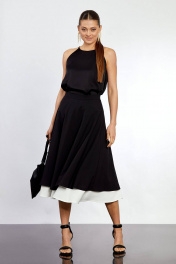 Юбка: - силуэт расширенный - покрой полусолнце - длина миди - верх с поясом - застёжка сзади в среднем шве на потайную молнию и петлю с пуговицей на поясе - на подкладке. Подъюбник: - из подкладночной ткани «гранд» и поливисзовы - силуэт расширенный - длина миди - верх с поясом на резинке