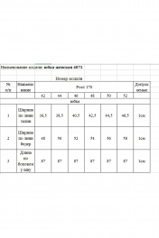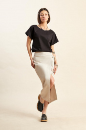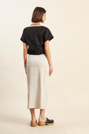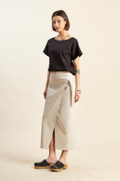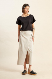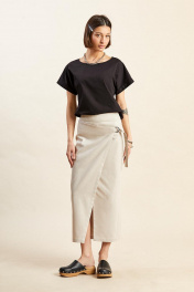 Юбка: - силуэт прямой; - длина миди; - спереди левая часть с высоким вырезом, а правая на запах, с застёжкой на пряжку-полукольца и пояс; - застёжка на потайную молнию в среднем шве сзади; - спереди и сзади вытачки; - слегка заниженная талия, с поясом, входящим в молнию.