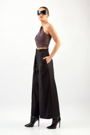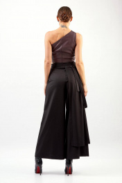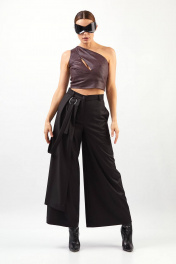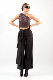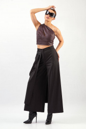 Кюлоты: - расширенный силуэт - справа отлетная деталь и декоративная пата, закреплённая в кольцах - шлёвки на притачном поясе - карманы в боковых швах - застёжка на молнию и пуговицу