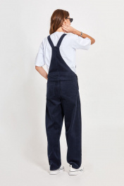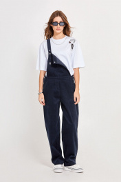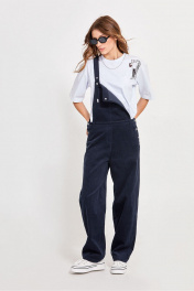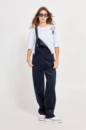 Комбинезон из вельвета: - прямой силуэт - верх в форме трапеции с широкими бретелями, застёгивающимися на кнопки - спереди сверху накладной карман - карманы в боковых швах с отрезным бочком - имитация гульфика - сзади низ комбинезона с кокеткой и накладными карманами - по середине притачной пояс