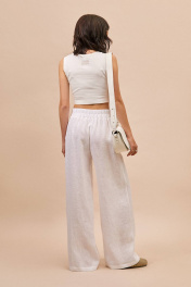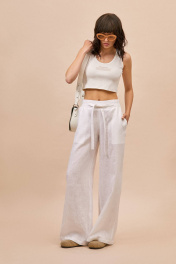 Брюки: - прямой силуэт - пояс с частичной резинкой и завязками спереди - в боковых швах карманы