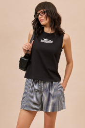 Топ: - прилегающий силуэт - круглый вырез горловины - окантовка по горловине и проймам - укороченная линия плеча - принт спереди