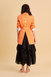 Жакет из джинса: - полуприталенный силуэт - пиджачный воротник - спереди вытачки - рукава втачные двухшовные - боковые карманы, под левым карманом печать - застежка на две кнопки - пояс в комплекте - на спинке средний шов и высокая шлица с печатью на правой стороне - подкладка с контрастным кантом по линии талии - внутренние карманы - сзади вышивка и аппликация с логотипом бренда и пата с полукольцом