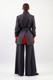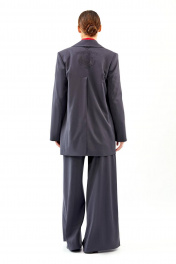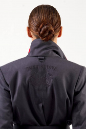 Жакет: - полуприталенный силуэт - пиджачный воротник - спереди вытачки - рукава втачные двухшовные - проезные карманы - застежка на кнопки - пояс в комплекте - на спинке средний шов и высокая шлица - на подкладке - внутренние карманы - сзади вышивка и кожаная аппликация с логотипом бренда и пата с полукольцом