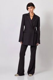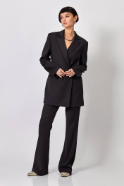 Жакет: - полуприталенный силуэт - пиджачный воротник - спинка со средним швом - карманы без клапанов - застежка на потайные кнопки - без шлёвок - удлинённый, низ прямой. Брюки-клёш от колена: -полуприлегающий силуэт - клёш от колена -в боковых швах карманы -верх с поясом и шлёвками -застёжка на молнию и петлю с пуговицей на поясе