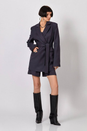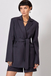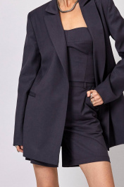 Жакет: - полуприталенный силуэт - пиджачный воротник - спереди вытачки - рукава втачные двухшовные - прорезные карманы - застежка на кнопки - пояс в комплекте - на подкладке - внутренние карманы Шорты: - прямой силуэт - карманы в боковых швах - пояс со шлёвками - застёжка в боковом шве Топ: - прилегающий силуэт - на корсетных косточках - по спинке молния - верх переда усилен поролоновыми чашками