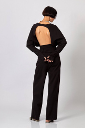 Джемпер с открытой спиной: - О-силуэт -покрой «летучая мышь» -сильно спущена линия плеча -круглый широкий вырез горловины -рукав удлинённый с вырезом для большого пальца -на спинке высокий и широкий вырез, открывающий всю спину -по низу широкий притачной пояс с посадкой чуть ниже талии Брюки с ассиметричной застёжкой: - ткань: футер двухнитка - заниженная посадка - силуэт расширенный книзу -клёш от бедра - в боковых швах карманы - верх с поясом и шлёвками - спереди ассиметричная застёжка на молнию и петлю с пуговицей