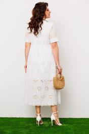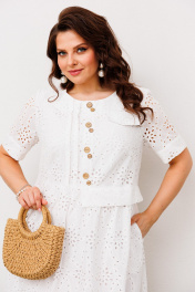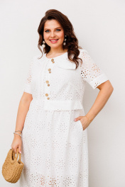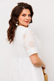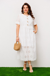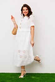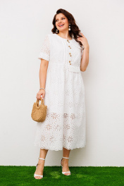 Платье женское отрезное по линии талии, длиной ниже колена, предназначено для повседневной носки. Верхняя часть переда с двумя нагрудными вытачками, с двумя односторонними зафиксированными складками справа, со средним швом с односторонней зафиксированной складкой, с цельнокроеной отлетной баской, с фигурным настрочным клапаном слева. Складка среднего шва декорируется 4-мя большими и 4-мя маленькими декоративными пуговицами. Нижняя часть переда с легкой сборкой по верхнему срезу. Верхняя часть спинки с двумя талиевыми вытачками, верхний срез нижней части спинки с легкой сборкой, расположенной между вытачками верхней части. В боковых швах платья обработаны карманы. Горловина круглая, обтачная, без воротника. Рукав втачной, короткий, одно шовный. Платье на хлопковой подкладке. Платье с плечевыми накладками. Длина спинки 115 см. Длина рукава 28 см