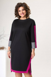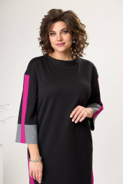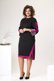 Платье женское для повседневной носки. Платье женское прямого силуэта, длиной за колено, с фигурным низом "ступенька". Перед с двумя нагрудными вытачками. Спинка цельнокроеная. Боковые швы с фигурными разрезами. Разрезы и низ платья с приточными планками из отделочной ткани. Горловина круглая с втачной стойкой. Платье со спущенным плечом. Рукав втачной, длиной 7/8, с приточной вертикальной планкой из отделочной ткани по центру и приточной манжетой из отделочной ткани. Платье без плечевых накладок. Длина рукава от горловины 60 см, длина спинки 103 см.