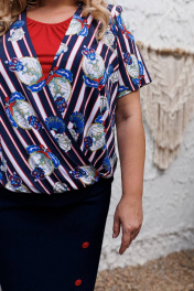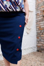 Платье женское предназначено для повседневной носки. Платье женское полуприлегающего силуэта, длиной до середины икры. Платье отрезное по линии бёдер. Верхняя часть переда двойная, нижняя из отделочной ткани с лёгкой сборкой по горловине, верхняя с запахом и с лёгкой сборкой по нижнему срезу. Нижняя часть переда (юбка) с притачным бочком, шов соединения декорирован 3-мя контрастными пришивными пуговицами. Верхняя часть спинки с лёгкой сборкой по нижнему срезу. Нижняя часть (юбка) со средним швом, заканчивающимся шлицей. Шов соединения верхней и нижней частей платья с втачным отлётным поясом. Горловина фигурная, без воротника. Рукав втачной короткий одношовный. Платье с плечевыми накладками. Длина спинки платья 116,5 см, длина рукава 25 см.