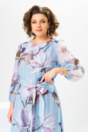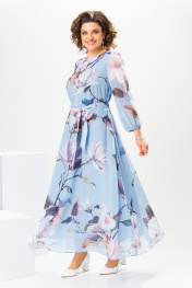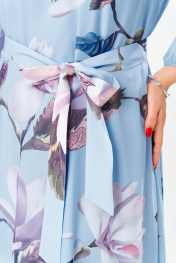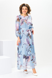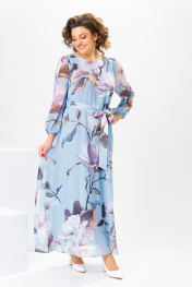 Платье женское относится к нарядной торжественной одежде. Платье женское отрезное по линии талии, расширенное к низу, длинное. Верхняя часть переда с 2-мя нагрудными вытачками, нижняя часть цельнокроеная. Верхняя часть спинки с 2-мя таллиевыми вытачками, с обработанным разрезом по головине, фиксирующимся на 1-ну навесную петлю и 1-ну пришивную пуговицу; нижняя часть спинки цельнокроеная. Горловина круглая, обточная, без воротника. Рукав втачной одно шовный, длинный. Рукав со сборкой по окату. Низ рукава собран на эластичную тесьму. Платье на подкладке. Платье без плечевых накладок. К платью прилагается съёмный пояс. Длина спинки платья 137 см, длина рукава 55 см.