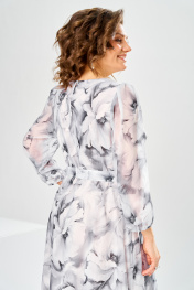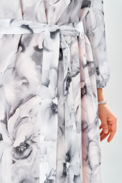 Платье женское относится к нарядной торжественной одежде. Платье женское отрезное по линии талии, расширенное к низу, длинное. Верхняя часть переда с 2-мя нагрудными вытачками, нижняя часть цельнокроеная. Верхняя часть спинки с 2-мя таллиевыми вытачками, с обработанным разрезом по головине, фиксирующимся на 1-ну навесную петлю и 1-ну пришивную пуговицу; нижняя часть спинки цельнокроеная. Горловина круглая, обточная, без воротника. Рукав втачной одно шовный, длинный. Рукав со сборкой по окату. Низ рукава собран на эластичную тесьму. Платье на подкладке. Платье без плечевых накладок. К платью прилагается съёмный пояс. Длина спинки платья 137 см, длина рукава 55 см.
