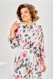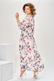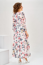 Платье женское относится к нарядной торжественной одежде. Платье женское отрезное по линии талии, расширенное к низу, длинное. Верхняя часть переда с 2-мя нагрудными вытачками, нижняя часть цельнокроеная. Верхняя часть спинки с 2-мя таллиевыми вытачками, с обработанным разрезом по головине, фиксирующимся на 1-ну навесную петлю и 1-ну пришивную пуговицу; нижняя часть спинки цельнокроеная. Горловина круглая, обточная, без воротника. Рукав втачной одно шовный, длинный. Рукав со сборкой по окату. Низ рукава собран на эластичную тесьму. Платье на подкладке. Платье без плечевых накладок. К платью прилагается съёмный пояс. Длина спинки платья 137 см, длина рукава 55 см.